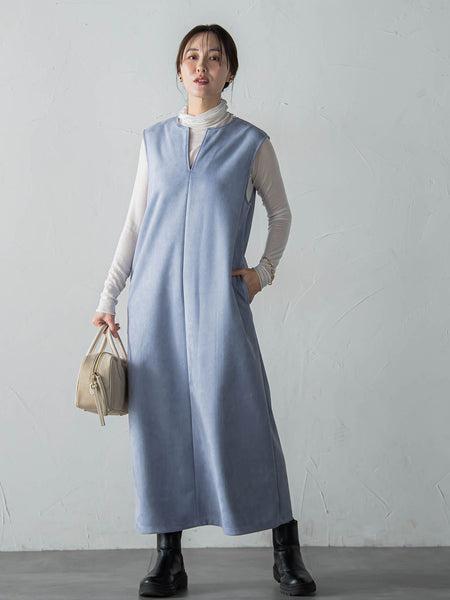 【デザイン】すとんと落ちるストレートシルエットが上品なフェイクスエードのジャンパースカート。ストレッチ性があり動きやすく、ゆとりのある設計でボディラインを拾いにくいのが特徴です。顔まわりをすっきり見せるキーネックで、インナー次第で雰囲気を変えながら着用いただけます。【素材】やわらかくしなやかなフェイクスエード素材を使用。ほどよい厚みとマットな質感で、シンプルでもきれい見えする一枚です。ストレッチが効いており、長時間の着用でも快適。手洗い可能で日常使いしやすいイージーケア素材です。※濃色は色移り防止のため、単独洗いを推奨しています。【スタイリング】タートル、ブラウス、薄手ニットなど、合わせるインナーによって印象が変わり、ロングシーズン活躍。ブーツできれいめにも、スニーカーでカジュアルにも対応します。【仕様】裏地なし/ポケットあり/後ろベンツあり(しつけ糸付き)