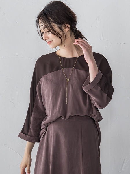 柔らかなスエード調サテンに、繊細なシアー切り替えを組み合わせた上品なブラウス。