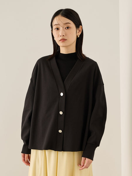 ●POINT程よく肉感の感じられるマットな風合いと繊細なシボ(凹凸)感が上品なカットジョーゼット素材を使用しています。キレイ目なテクスチャーなのに、イージーな着心地とほんのり反発感がありシワの目立ちにくさが魅力の優秀テキスタイルです。前後差があり、フロントが少し短くなっているので、ボトムスとの着合わせのバランスが取りやすいフォルムになっています。プルオーバーとしてもカーディガンとして羽織としても便利な一枚です。アンティーク調の飾りボタンがシックな印象を添えます。同素材を使用したアイテムに、カットジョーゼットウエストタックブラウス(4113-57056)、カットジョーゼットイージーワイドパンツ(4110-57008)がございます。----------------------------------透け感:淡色のみややあり厚さ: やや厚い伸縮性:あり裏地: なしポケット: なし--------------------------------------------------------------------------------------------------洗濯方法家庭洗濯:液温は40℃を限度とし、手洗いができる。自然乾燥:日陰の平干しがよい。アイロン:底面温度120℃を限度としてアイロン仕上げができる。ドライクリーニング:ドライクリーニング禁止。----------------------------------------------------------------■モデル身長 165cm 着用サイズ M※画像の商品はサンプルとなりますので実際の商品と仕様、加工、サイズが若干異なる場合がございます。※お客様のモニター環境により実際のお色と多少異なる場合がございます。※撮影状況や光の当たり具合により、色合いが異なって見える場合がございます。関連ワード:ketty ケティ レディース 新作 大人コーデ 2025秋冬 2025AW 秋冬 秋物 秋服 カーディガン ニット ポリエステル Vネック 無地 長袖 オフィス 旅行 デート 通勤 ホテルディナー アフタヌーンティー