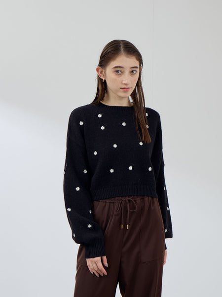 ●POINTアルパカタッチのふんわりとした質感の素材を使用したクロップド丈のニットプルオーバーです。小ぶりの可憐なマーガレットのフラワー刺繍デザインが施されたボクシーフォルムのニットプルオーバーは、遠目にはドット柄のようにも見えるので、柄物に抵抗感のある方にもおすすめしたい一枚です。ふんわりとした袖先のスリーブデザインが愛らしさを引き立てます。ブラック地×オフホワイト、ネイビー×イエロー、チャコールグレー×ピンクの配色になっており、カラーごとに印象の異なる一枚です。----------------------------------透け感:なし厚さ: やや厚い伸縮性:あり裏地: なしポケット: なし--------------------------------------------------------------------------------------------------洗濯方法家庭洗濯:液温は30℃を限度とし、手洗いができる。自然乾燥:日陰の平干しがよい。アイロン:底面温度120℃を限度としてアイロン仕上げができる。ドライクリーニング:石油系溶剤による弱いドライクリーニングができる。----------------------------------------------------------------■モデル身長 165cm 着用サイズ M※画像の商品はサンプルとなりますので実際の商品と仕様、加工、サイズが若干異なる場合がございます。※お客様のモニター環境により実際のお色と多少異なる場合がございます。※撮影状況や光の当たり具合により、色合いが異なって見える場合がございます。関連ワード:QUEENS COURT クイーンズコート レディース 新作 フェミニン 大人コーデ 2025秋冬 2025AW 秋冬 秋物 秋服 ニット ポリエステル アクリル ナイロン クルーネック 花・植物 刺繍 長袖