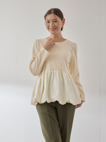 ●POINT程よく肉感の感じられるシルキータッチのジャージー(カットソー)素材を使用し、ワッシャータフタ素材で切り替えバルーンヘムデザインにしたプルオーバーです。変型ペプラムラインのトップスなので、Iラインスカートやテーパードなどレッグラインに寄り添うシルエットのボトムスをあわせていただくとバランスよくご着用いただけます。コーディネートを考えることなくこれ一枚で旬のルックが完成するデザイントップスです。----------------------------------透け感:淡色のみややあり厚さ: 普通伸縮性:あり裏地: なしポケット: なし--------------------------------------------------------------------------------------------------洗濯方法家庭洗濯:液温は40℃を限度とし、手洗いができる。自然乾燥:日陰の吊り干しがよい。アイロン:底面温度120℃を限度としてアイロン仕上げができる。ドライクリーニング:石油系溶剤による弱いドライクリーニングができる。----------------------------------------------------------------■モデル身長 165cm 着用サイズ M※画像の商品はサンプルとなりますので実際の商品と仕様、加工、サイズが若干異なる場合がございます。※お客様のモニター環境により実際のお色と多少異なる場合がございます。※撮影状況や光の当たり具合により、色合いが異なって見える場合がございます。関連ワード:QUEENS COURT クイーンズコート レディース 新作 フェミニン 大人コーデ 2025秋冬 2025AW 秋冬 秋物 秋服 カットソー コットン ポリエステル