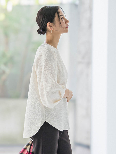【デザイン】ポコポコとした表情感のあるフクレジャカードが可愛いブラウス。袖のボリューム感と素材の程よいハリ感がマッチしており、分量感がありながらエアリーな雰囲気もまとったトップスに仕上がっています。ラウンドヘムなので、イン・アウトどちらも決まる仕様に。着映えまちがいなしの大人デザインブラウスです!【素材】ポコポコとした表情感と軽さが特長のふくれジャガード。【スタイリング】ボトムのシルエット問わず着て頂けるデザイン。パンツならフロントインでスタイルアップ見え、スカートならオールインで目線を上にもってくるスタイルがおすすめ。素材感がポイントになっているので、ボトムはプレーンな素材のものを選んでいただくのがバランスよく着用いただくちょっとしたコツです!----------------------------------------------------------------洗濯方法家庭洗濯:液温は40℃を限度とし、洗濯機で弱い洗濯ができる。自然乾燥:日陰の吊り干しがよい。アイロン:底面温度160℃を限度としてアイロン仕上げができる。ドライクリーニング:石油系溶剤による弱いドライクリーニングができる。----------------------------------------------------------------■モデル身長 165cm/着用サイズ 9号※商品タグに記載されたサイズはヌードサイズです。実際の商品のサイズは商品情報の実寸をご確認ください。※画像の商品はサンプルとなりますので実際の商品と仕様、加工、サイズが若干異なる場合がございます。※お客様のモニター環境により実際のお色と多少異なる場合がございます。※撮影状況や光の当たり具合により、色合いが異なって見える場合がございます。関連ワード:LAUTREAMONT ロートレアモン レディース きれいめカジュアル 大人カジュアル ナチュラル きれいめ キレイめ 上品 シンプル ベーシック 通勤スタイル オフィスカジュアル キャリア オフィススタイル 新作 2025秋冬 2025AW 秋冬 秋物 秋服