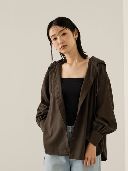 控えめながらも上品な光沢と滑らかな手触りが特徴のポリエステルレーヨンのテキスタイルを使用したシャツタイプのパーカーです。