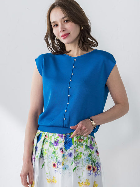 シンプルなVネックと、クルーネックにパール装飾、前後2wayでお楽しみいただけます。