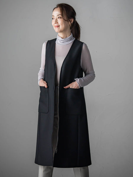 【デザインの特徴】梳毛のボンディング素材を使用したジャンパースカートは、ほどよいハリ感とクリーンな表情が魅力。ジップアップ仕様で着脱も軽やかに、レングスを短めに設定することで、ジャンパースカートとしてはもちろん、ジレのように羽織るスタイリングも楽しめます。ニットやブラウスとのレイヤードで、シーンに合わせた表情を演出できる万能アイテム。きちんと感がありながらも動きやすく、日常からお出かけまで幅広く活躍。シーズンを通してワードローブに頼れる一着です。【素材の特徴】ライトで柔らかなウールストレッチ素材にボンディング加工を施したラエフオリジナル国産素材になります。構築的なフォルムを作ることができるハリ感を持ちながらも、非常に軽量でスポンディッシュな柔らかさがあり、軽く着用しやすい素材感に仕上げております。----------------------------------------------------------------洗濯方法家庭洗濯:家庭での洗濯禁止。アイロン:底面温度120℃を限度としてアイロン仕上げができる。ドライクリーニング:石油系溶剤による弱いドライクリーニングができる。----------------------------------------------------------------※画像の商品はサンプルとなりますので実際の商品と仕様、加工、サイズが若干異なる場合がございます。※お客様のモニター環境により実際のお色と多少異なる場合がございます。※撮影状況や光の当たり具合により、色合いが異なって見える場合がございます。※商品タグに記載されたサイズはヌードサイズです。実際の商品のサイズは商品情報の実寸をご確認ください。関連ワード:la.f… ラ エフ レディース 新作 大人コーデ シンプル フォーマル モード マニッシュ 2025秋冬 2025AW 秋冬 秋物 秋服