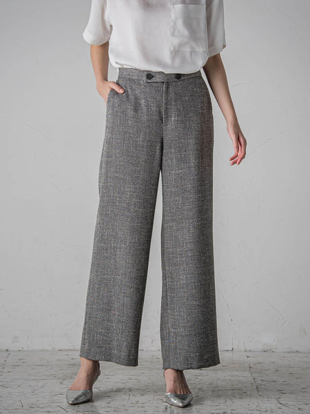 【デザインの特徴】ウールが入っていないのに、クラシカルで表情豊かなツィード素材を使用したワイドパンツ。ごわつかず、さらりとしているのでシーズン長くお楽しみいただけます。ウェストのボタンアクセントを入れることで、シンプルなトップスをあわせてもおしゃれにきまります。【機能性】◆Easy Careご自宅でのお手入れが簡単【素材の特徴】トリクシオンスラブと、レーヨンリングを使用し、ウールに代わるツイード素材をご提案。幅広いシーンに対応するこれからのツイード素材です。----------------------------------洗濯方法家庭洗濯:液温は30℃を限度とし、洗濯機で非常に弱い洗濯ができる。自然乾燥:日蔭の吊り干しがよい。アイロン:底面温度150℃を限度としてアイロン仕上げができる。ドライクリーニング:石油系溶剤による弱いドライクリーニングができる。----------------------------------■モデル1 身長 173cm/着用サイズ 9号■モデル2 身長 171cm/着用サイズ 9号※画像の商品はサンプルとなりますので実際の商品と仕様、加工、サイズが若干異なる場合がございます。※お客様のモニター環境により実際のお色と多少異なる場合がございます。※撮影状況や光の当たり具合により、色合いが異なって見える場合がございます。※商品タグに記載されたサイズはヌードサイズです。実際の商品のサイズは商品情報の実寸をご確認ください。関連ワード:la.f… ラ エフ 2024秋冬 2024AW 秋 秋服 ロングパンツ ワイドルーズ 10分丈 ポリエステル レーヨン シンプル フォーマル モード マニッシュ チェック ツィード