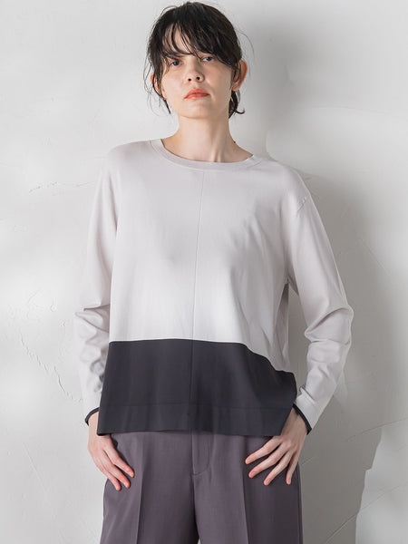 【デザインの特徴】リピーターの多いTシャツニットを長袖にブラッシュアップ。一枚で着映えし、インナーとしても着こなしのアクセントになる配色ブロッキング。身頃中央のラインと脇にニットらしい編地組織を品よく入れています。フィットし過ぎないジャストなサイズ感でジャケットなどのインナーとしても楽しんでいただけます。【機能性】◆Washableご自宅での手洗いが可能【素材の特徴】ストレッチが効いたレーヨンストレッチ糸。程よい光沢でサラっとした爽やかで肌離れ良く着ていただけます。 編んだ際に微細な凹凸が出ることでボディラインを拾わず、程良い肉厚感もあるので透けも気になりません。手洗いOKのイージーケアで、デイリーにつかえる素材です。----------------------------------洗濯方法家庭洗濯:液温は40℃を限度とし、手洗いが出来る。自然乾燥:日蔭の平干しが良い。アイロン:底面温度150℃を限度としてアイロン仕上げができる。ドライクリーニング:石油系溶剤による弱いドライクリーニングができる。----------------------------------■モデル1 身長 173cm/着用サイズ 9号■モデル2 身長 171cm/着用サイズ 9号※画像の商品はサンプルとなりますので実際の商品と仕様、加工、サイズが若干異なる場合がございます。※お客様のモニター環境により実際のお色と多少異なる場合がございます。※撮影状況や光の当たり具合により、色合いが異なって見える場合がございます。※商品タグに記載されたサイズはヌードサイズです。実際の商品のサイズは商品情報の実寸をご確認ください。関連ワード:la.f… ラ エフ 2024秋冬 2024AW 冬 冬服 ニット ポリエステル レーヨン ナイロン クルーネック 配色 長袖 シンプル フォーマル モード マニッシュ インナー イージーケア
