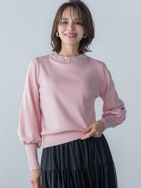 【デザインの特徴】華やぎシーズンに寄り添うビジューネックニット。数種類の煌めくビジューとパール・ビーズを装飾した繊細なネックデザインが華やかな印象です。お呼ばれシーンでも活躍する上品な一着。【素材の特徴】ニットは糸の繊維が細く、高品質で保温性に優れた素材を使用しています。美しい目づらと心地よい肌触りが特徴。----------------------------------洗濯方法家庭洗濯:液温は40℃を限度とし、手洗いが出来る。自然乾燥:日蔭の平干しが良い。アイロン:底面温度150℃を限度としてアイロン仕上げができる。ドライクリーニング:石油系溶剤による弱いドライクリーニングができる。----------------------------------■モデル身長 169cm/着用サイズ M※画像の商品はサンプルとなりますので実際の商品と仕様、加工、サイズが若干異なる場合がございます。※お客様のモニター環境により実際のお色と多少異なる場合がございます。※撮影状況や光の当たり具合により、色合いが異なって見える場合がございます。※商品タグに記載されたサイズはヌードサイズです。実際の商品のサイズは商品情報の実寸をご確認ください。関連ワード:Viaggio Blu ビアッジョブルー レディース キレイめ フェミニン エレガント 華やか 上品 秋 秋服 2024AW AW 2024秋冬