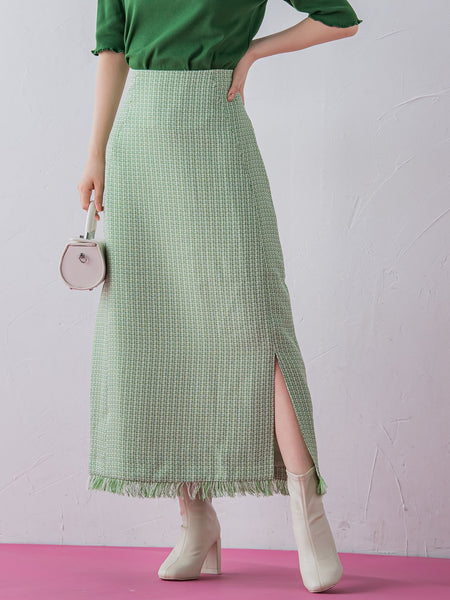 ●ポイント・秋らしさ満点のツイードスカート・一枚投入するだけで秋のムードがたっぷり・シンプルなトップスと合わせるだけでオシャレが叶う!・ナローシルエット●デザイン大人ガーリーな定番ツイードスカート!太すぎず細すぎないセミタイトなナローシルエットが登場!今季トレンドのツイード生地を使用したスカートなので1枚着ていただくだけで、季節感とこなれ感のあるお洒落コーデが完成します。タイトシルエットでありながらウエストゴムでストレスフリーな履き心地。裾スリットが入ってるので、歩きやすさもばっちり!歩くたびにスリットからさりげなく見える肌見せが、大人な印象に。●オススメコーデハイウエストデザインだから、どんなトップスにもバランス良く合わせられるのが嬉しい。暑い時期はTシャツやブラウス。冬に向けてはニット合わせも可愛い。スニーカーと合わせたカジュアルミックスも相性抜群。こなれ感のある大人カジュアルコーデが完成します。トップスインですっきりスタイルUPのスタイリングがオススメです。 【骨格タイプの説明】・ストレートタイプ全体的に筋肉質で体にメリハリがあるタイプ腰とバスト位置も高く厚みがあり、ひざ下は細目・ウェーブタイプ全体的に柔らかな曲線の体のライン重心が下半身にあり、上半身は華奢で薄い印象・ナチュラルタイプ筋肉や脂肪があまり感じられなく重心の偏りがないタイプ骨組みはしっかりしており、関節が目立ちやすい----------------------------------洗濯方法家庭洗濯:液温は30℃を限度とし、洗濯機で非常に弱い洗濯ができる。自然乾燥:日蔭の吊り干しがよい。アイロン:底面温度110℃を限度としてアイロン仕上げができる。ドライクリーニング:石油系溶剤による弱いドライクリーニングができる。----------------------------------■モデル身長 162cm/163cm 着用サイズ M※画像の商品はサンプルとなりますので実際の商品と仕様、加工、サイズが若干異なる場合がございます。※お客様のモニター環境により実際のお色と多少異なる場合がございます。※撮影状況や光の当たり具合により、色合いが異なって見える場合がございます。関連ワード:VICKY ビッキー レディース 夏物 夏服 秋物 秋服 新作 大人カジュアル ポリエステル シンプル キレカジ フェミニン ガーリー ゴム タイトスカート ツィード フリンジ 2023秋冬 15度から20度の気温におすすめ