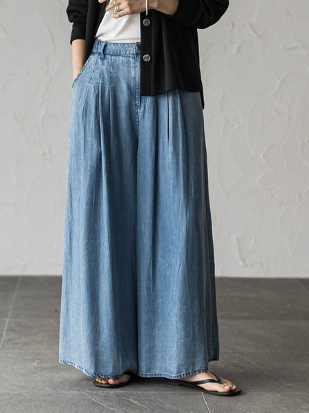 【デザインPOINT】「てろっと、やみつきデニムパンツ。」リラックス感がありながら、光沢のあるとろみが女っぽい、“ゆれるデニム”シリーズ。スカート感覚でさらっと涼しく穿けて、大人カジュアルなスタイリングが叶う、キュロットパンツ。タックで波打つシルエットを表現した、フレア・パターン。シルバーのメタル釦、タックをおさえたステッチ、ウエストは楽な穿き心地のサイドゴムがポイント。【スタイリング】ショート丈のトップスや、ゆるトップスの前タックINが好バランス。同シリーズのシャツやジャケット合わせもおすすめです。【素材の特徴】【バイオシルクデニム/パウダー加工】まず、この着心地に驚く。てろっと肌に落ちる軽やかな感覚に魅了される、“ゆれるデニム”。シルクのような光沢感のあるセルロース素材に、パウダー加工を施し、こなれたムードを表現。----------------------------------------------------------------洗濯方法家庭洗濯:液温は30℃を限度とし、洗濯機で非常に弱い洗濯ができる。自然乾燥:日陰の吊り干しがよい。アイロン:底面温度120℃を限度としてアイロン仕上げができる。ドライクリーニング:石油系溶剤による弱いドライクリーニングができる。----------------------------------------------------------------■モデル身長 166cm 170cm / 着用サイズ M※画像の商品はサンプルとなりますので実際の商品と仕様、加工、サイズが若干異なる場合がございます。※お客様のモニター環境により実際のお色と多少異なる場合がございます。※撮影状況や光の当たり具合により、色合いが異なって見える場合がございます。関連ワード:MAYSON GREY メイソングレイ レディース 新作 大人コーデ 大人カジュアル 2026春夏 2026SS 春夏 春物 春服 フレアパンツ カジュアル ゴム デニム