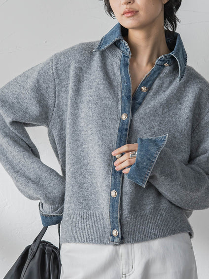【新色追加】デニムレイヤード風カーディガン≪手洗い可能≫