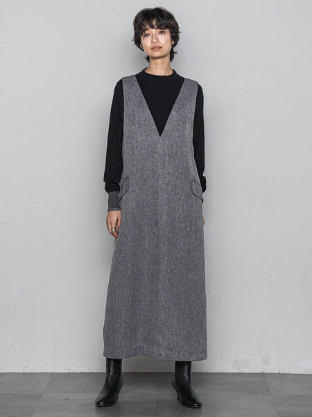 【デザインPOINT】「縦落ちライン、ミニマルジャンドレ。」潔い深めVネックの縦落ちラインがすっきり見えを叶える、ツイード・ジャンパードレス。クラシカルでミニマルなムードが、品良くきまる一着。ほどよいゆとりを残して、身体のラインを拾わず縦落ちするシルエットに拘ったパターン。斜めに付けたフラップポケットが、メリハリをつくるアクセントに。【スタイリング】インナー次第で、幅広いシーンに対応。コンパクトなニットやタートル、とろみのあるシャツ合わせがおすすめ。【素材の特徴】【ライトツイード】デイリーに使いやすい、軽くしなやかなポリエステル・ライトツイード素材。凹凸感とメランジカラーが、クラシカルな表情をつくります。----------------------------------------------------------------洗濯方法家庭洗濯:液温は40℃を限度とし、手洗いができる。自然乾燥:日陰の吊り干しがよい。アイロン:底面温度120℃を限度としてアイロン仕上げができる。ドライクリーニング:石油系溶剤による弱いドライクリーニングができる。----------------------------------------------------------------■モデル身長 166cm 170cm / 着用サイズ M※画像の商品はサンプルとなりますので実際の商品と仕様、加工、サイズが若干異なる場合がございます。※お客様のモニター環境により実際のお色と多少異なる場合がございます。※撮影状況や光の当たり具合により、色合いが異なって見える場合がございます。関連ワード:MAYSON GREY メイソングレイ レディース 新作 大人コーデ 大人カジュアル 2025秋冬 2025AW 秋冬 秋物 秋服 ロング ノースリーブ 合成繊維/ポリエステル