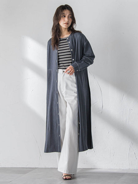 【デザインPOINT】「何気ない日も、絵になる一枚。」サイドプリーツと配色ステッチがアクセントになった、着映えるシャツワンピース。大きめの配色釦、立体的な袖、抜け感あるバンドカラー、甘さをおさえたデザインがポイント。ほどよいゆとりでリラックス感あるシルエット。高めに設定したウエスト切替えが、スタイルアップを叶えます。プリーツにもステッチをきかせることで広がりをおさえ、縦ラインを意識したパターン。【スタイリング】合わせる小物次第で、デイリーからお出かけまで活躍。シューズは、ショートブーツやローファー、きれいめスニーカーがおすすめ。【素材の特徴】【Pe/Ry/Puストレッチシャンブレー】心地良い落ち感と、ほのかな光沢感が魅力の、ストレッチシャンブレー素材を使用。仕立て映えしてシワになりにくく、きれい見えします。----------------------------------------------------------------洗濯方法家庭洗濯:液温は40℃を限度とし、手洗いができる。自然乾燥:日陰の吊り干しがよい。アイロン:底面温度120℃を限度としてアイロン仕上げができる。ドライクリーニング:石油系溶剤による弱いドライクリーニングができる。----------------------------------------------------------------■モデル身長 166cm 170cm / 着用サイズ M※画像の商品はサンプルとなりますので実際の商品と仕様、加工、サイズが若干異なる場合がございます。※お客様のモニター環境により実際のお色と多少異なる場合がございます。※撮影状況や光の当たり具合により、色合いが異なって見える場合がございます。関連ワード:MAYSON GREY メイソングレイ レディース 新作 大人コーデ 大人カジュアル 2026春夏 2026SS 春夏 春物 春服 シャツ ロング 無地 長袖 合成繊維/ポリエステル レーヨン