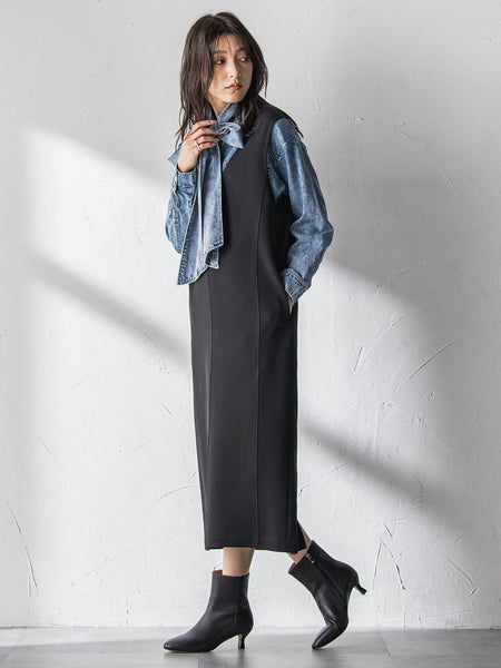 【デザインPOINT】「重ねて叶える、きれい見え。」すっきりきれい見えを叶える、前後Vネックのジャンパードレス。シンプルながらも、縦ラインを強調するパネル切替えを入れ、女っぽく計算されたデザイン。裾にかけて自然とINしたパターンで、すらっと-3kg見えのシルエット。身体のラインをひろわず、楽に着られるサイズ感。深めの後ベンツ開きで、足捌きの良さと抜け感をプラス。【スタイリング】コンパクトなカットソーやボウタイブラウス、デイリーからきちんとまでシーンが広がる一枚。インナー次第で、ロングシーズン活躍します。【素材の特徴】【サンディカットジョーゼット】『EVERYDAY JERSEY』“楽にきれいを叶える”、ジョーゼットジャージー。表情のある表面感、快適なストレッチ性とほどよい厚み。毎日に寄り添う、きちんと見え素材。----------------------------------------------------------------洗濯方法家庭洗濯:液温は40℃を限度とし、手洗いができる。自然乾燥:日陰の吊り干しがよい。アイロン:底面温度120℃を限度としてアイロン仕上げができる。ドライクリーニング:ドライクリーニング禁止。----------------------------------------------------------------■モデル身長 166cm 170cm / 着用サイズ M※画像の商品はサンプルとなりますので実際の商品と仕様、加工、サイズが若干異なる場合がございます。※お客様のモニター環境により実際のお色と多少異なる場合がございます。※撮影状況や光の当たり具合により、色合いが異なって見える場合がございます。関連ワード:MAYSON GREY メイソングレイ レディース 新作 大人コーデ 大人カジュアル 2026春夏 2026SS 春夏 春物 春服 ジャンパー 無地 ノースリーブ 合成繊維/ポリエステル