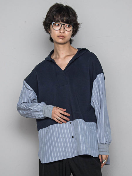 【デザインPOINT】「カジュアルに抜けて、シャツで締める。」スウェットフーディに、ストライプシャツを重ねたような、ドッキングプルオーバー。スキッパーデザインにすることで、顔周りに抜け感を演出した一枚。肩のチカラを抜いて着られる、リラックス感あるサイズ設定。ニット糸で編みたてた袖口は、アクセントになりつつ、たくし上げが簡単にできるのも嬉しいポイント。【スタイリング】シンプルなボトムに合わせるだけで、洒落見えスタイリングが完成。きれいめパンツやIラインスカート合わせがおすすめ。【素材の特徴】【ライトダンボール/先染めストライプ】ソフトでクリアな表面が魅力のダンボールジャージーに、先染めストライプ生地を組み合わせ、ニットでもストライプ柄を表現しました。----------------------------------------------------------------洗濯方法家庭洗濯:液温は30℃を限度とし、洗濯機で非常に弱い洗濯ができる。自然乾燥:日陰の吊り干しがよい。アイロン:底面温度120℃を限度としてアイロン仕上げができる。ドライクリーニング:石油系溶剤による弱いドライクリーニングができる。----------------------------------------------------------------■モデル身長 166cm 170cm / 着用サイズ M※画像の商品はサンプルとなりますので実際の商品と仕様、加工、サイズが若干異なる場合がございます。※お客様のモニター環境により実際のお色と多少異なる場合がございます。※撮影状況や光の当たり具合により、色合いが異なって見える場合がございます。関連ワード:MAYSON GREY メイソングレイ レディース 新作 大人コーデ 大人カジュアル 2025秋冬 2025AW 秋冬 秋物 秋服 コットン ポリエステル レーヨン ナイロン 無地 ストライプ 長袖 プルオーバーパーカー