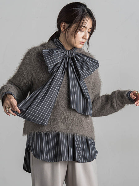 柔らかく繊細な毛足のロングフェザーヤーンにポリエステル糸を引き揃えて、表情のある柄編みに仕上げました。