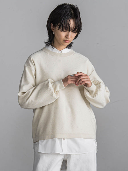 【デザインPOINT】さりげない煌めきに心つかまれる、ミニスパンコールヤーンを使用したニットプルオーバー。ギャザーでふんわりさせた袖と、サイドのラインがアクセントになったデザイン。すっきりきれいめに使えるサイジングの、BOXシルエット。襟ぐりと袖口はRIB編みでメリハリを付け、ストレッチ糸を引き揃えて耐久性を持たせています。【スタイリング】カジュアルにも、きれいめにも活躍。すっきりとした肉感だから、ボトムINスタイルやサロペットのインナーにも◎【素材の特徴】【12G RY/PE ミニスパンコールヤーン 天竺裏目】直径1mmの極小スパンコールを引き揃えた細番手のニット糸に、ストレッチ糸を入れて、薄すぎないほどよい肉感の編地に仕上げました。ました。----------------------------------洗濯方法家庭洗濯:液温は40℃を限度とし、手洗いが出来る。自然乾燥:日蔭の平干しが良い。アイロン:底面温度110℃を限度としてアイロン仕上げができる。ドライクリーニング:石油系溶剤による弱いドライクリーニングができる。----------------------------------■モデル身長 166cm 170cm / 着用サイズ M※画像の商品はサンプルとなりますので実際の商品と仕様、加工、サイズが若干異なる場合がございます。※お客様のモニター環境により実際のお色と多少異なる場合がございます。※撮影状況や光の当たり具合により、色合いが異なって見える場合がございます。関連ワード:MAYSON GREY socolla メイソングレイ ソコラ 大人カジュアル 2024秋冬 2024AW 冬 冬服 ニット ポリエステル レーヨン キレカジ オフィス