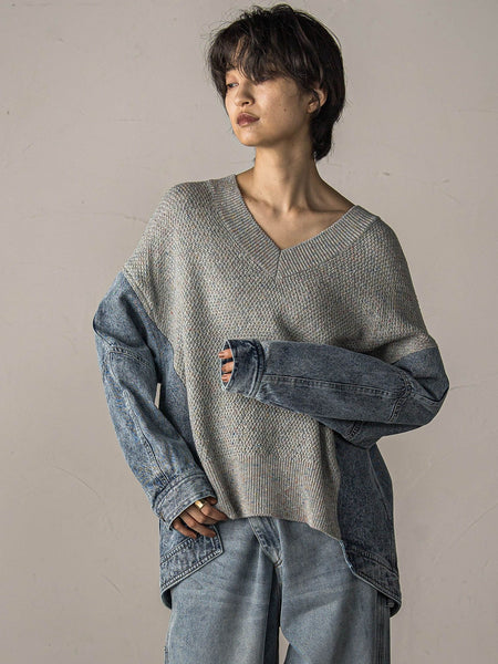 【デザインPOINT】「着るだけで、洒落見え決定」大好評のデニムドッキングニットが、アップデート。表情豊かなニットとこなれデニムの、着映えるドッキングデザイン。リブ仕立てのVネックが、カジュアルななかにすっきりとした印象。ほどよいゆとりのあるサイジングに、切替え効果でメリハリのあるBOXシルエットに仕上げました。前裾は直線ですっきりと、後裾はカーヴィなラインで安心感のあるパターン。【スタイリング】ニットの質感を活かして、ボトムはクリアな表面のシンプルなワイドパンツやスカートがおすすめ。カジュアル派はデニムonデニムも◎【素材の特徴】【5GG AC/Cカラーネップ 鹿の子】さらっとしたタッチのアクリル/綿ニット糸にカラーネップヤーンを組み合わせて、鹿の子編みで表情豊かな編地を表現。デニムは、加工感が出る9.8オンスを使用。----------------------------------------------------------------洗濯方法家庭洗濯:液温は40℃を限度とし、手洗いができる。自然乾燥:日陰の平干しがよい。アイロン:底面温度120℃を限度としてアイロン仕上げができる。ドライクリーニング:ドライクリーニング禁止。----------------------------------------------------------------■モデル身長 166cm 170cm / 着用サイズ M※画像の商品はサンプルとなりますので実際の商品と仕様、加工、サイズが若干異なる場合がございます。※お客様のモニター環境により実際のお色と多少異なる場合がございます。※撮影状況や光の当たり具合により、色合いが異なって見える場合がございます。関連ワード:MAYSON GREY メイソングレイ レディース 新作 大人コーデ 大人カジュアル 2025秋冬 2025AW 秋冬 秋物 秋服 ニット コットン ポリエステル アクリル デニム Vネック 無地 長袖