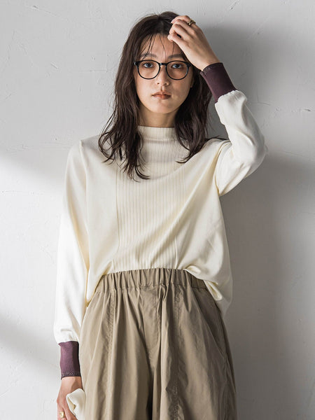 【デザインPOINT】「色違いで揃えたい、配色カフスニット。」配色カフスと、前中央のリブ切替えがポイントのニットプルオーバー。袖口にはラメライン、後衿ぐり裏にも配色を入れ、さりげないアクセントをきかせたデザインが魅力。身体のラインを拾いにくい、絶妙なゆとりを持たせたセットイン・シルエット。前中央リブの縦ライン効果で、すっきり見えが叶います。低めのボトルネックが、品良い印象に。【スタイリング】一枚着はもちろん、ジャンパードレスのインナーとしても活躍。キュロットやワイドパンツできれいめに合わせたり、デニムでカジュアルにも◎【素材の特徴】【14G レーヨン/ポリエステル 天竺】ストレッチ性に優れた細番手のレーヨン/ポリエステル糸を使用。さらっとしたタッチで、季節の変わり目からロングシーズンで活躍します。----------------------------------------------------------------洗濯方法家庭洗濯:液温は40℃を限度とし、手洗いができる。自然乾燥:日陰の平干しがよい。アイロン:底面温度120℃を限度としてアイロン仕上げができる。ドライクリーニング:石油系溶剤による弱いドライクリーニングができる。----------------------------------------------------------------■モデル身長 166cm 170cm / 着用サイズ M※画像の商品はサンプルとなりますので実際の商品と仕様、加工、サイズが若干異なる場合がございます。※お客様のモニター環境により実際のお色と多少異なる場合がございます。※撮影状況や光の当たり具合により、色合いが異なって見える場合がございます。関連ワード:MAYSON GREY メイソングレイ レディース 新作 大人コーデ 大人カジュアル 2025秋冬 2025AW 秋冬 冬物 冬服 ニット 配色 長袖