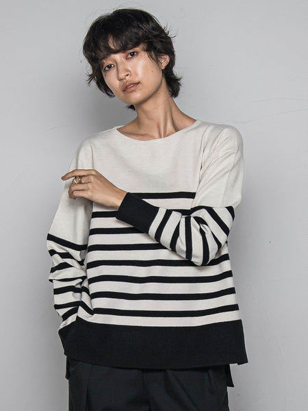 【デザインPOINT】「着映える、もっちりニット。」胸もとから切替えたボーダー柄が柔らかなリズムを描く、もっちりニットプルオーバー。袖口と裾の太めの配色始末がポイントになった、着映えるデザイン。大人の余裕を感じさせる“ゆとり”に拘った、サイジング。ボディラインを拾わず、今っぽいボクシーなシルエット。開きをおさえたボートネックが、抜け感をほどよくコントロール。【スタイリング】パンツからスカート、幅広くマッチ。ボーダーの一色をボトムやアウターとリンクさせると、洒落度がアップ。【素材の特徴】【スーパーストレッチ 12G 天竺】もっちりした弾力性のあるタッチがやみつきになる、ハイゲージニット。特殊な紡績による、肌馴染みの良い風合いと伸縮性が特徴。発熱加工で暖かさを実感していただけます。----------------------------------------------------------------洗濯方法家庭洗濯:液温は30℃を限度とし、洗濯機で非常に弱い洗濯ができる。自然乾燥:日陰の平干しがよい。アイロン:底面温度110℃を限度としてアイロン仕上げができる。ドライクリーニング:石油系溶剤による弱いドライクリーニングができる。----------------------------------------------------------------■モデル身長 166cm 170cm / 着用サイズ M※画像の商品はサンプルとなりますので実際の商品と仕様、加工、サイズが若干異なる場合がございます。※お客様のモニター環境により実際のお色と多少異なる場合がございます。※撮影状況や光の当たり具合により、色合いが異なって見える場合がございます。関連ワード:MAYSON GREY メイソングレイ レディース 新作 大人コーデ 大人カジュアル 2025秋冬 2025AW 秋冬 冬物 冬服 ニット セーター アクリル ポリエステル ボートネック ボーダー