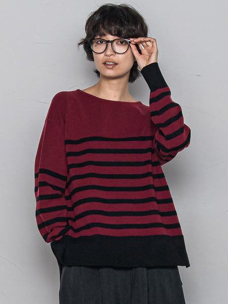 胸もとから切替えたボーダー柄が柔らかなリズムを描く、もっちりニットプルオーバー。