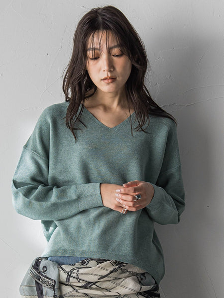 【デザインPOINT】「さりげなく、きらっと。」繊細なラメのきらめきが品のある印象をつくる、ニットプルオーバー。すっきり始末のVネックが女っぽく、肩の落ちたデザインが抜け感を演出します。バストにゆとりを持たせ、裾を絞ったリラックスシルエット。アウトで着るだけでバランスがきまる、計算されたカーヴィな前上がりの着丈もポイント。【スタイリング】ワイドパンツ、キュロット、スカートにマッチ。春めく色展開、シンプルなボトムに合わせるだけで、気分が上がるスタイリングに。【素材の特徴】【12G ウールブレンド ガーター】さらっとしたウールブレンドの、微細ラメニット糸を使用。ガーター編みで、伸縮性のあるもちっとしたタッチと、凹凸感を表現しました。----------------------------------------------------------------洗濯方法家庭洗濯:液温は30℃を限度とし、手洗いができる。自然乾燥:日陰の平干しがよい。アイロン:アイロン仕上げ禁止。ドライクリーニング:石油系溶剤による弱いドライクリーニングができる。----------------------------------------------------------------■モデル身長 166cm 170cm / 着用サイズ M※画像の商品はサンプルとなりますので実際の商品と仕様、加工、サイズが若干異なる場合がございます。※お客様のモニター環境により実際のお色と多少異なる場合がございます。※撮影状況や光の当たり具合により、色合いが異なって見える場合がございます。関連ワード:MAYSON GREY メイソングレイ レディース 新作 大人コーデ 大人カジュアル 2025秋冬 2025AW 秋冬 冬物 冬服 ニット ポリエステル アクリル ウール ナイロン Vネック 長袖