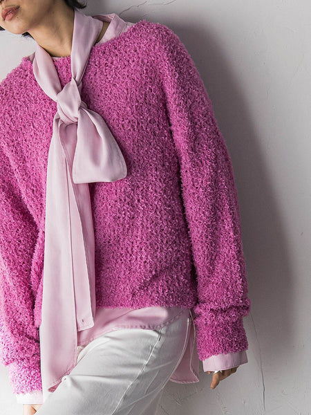 【デザインPOINT】「軽やかに、表情を纏う。」表情あるファンシーヤーンに惹きつけられる、ニットプルオーバー。華やかさがありながらも、日常に取り入れやすい一枚。顔まわりをすっきり見せる、ボートネックデザイン。ゆるっとラフでこなれたムードをつくる、ワイドBOXシルエット。コンパクトな丈感に設定し、ボリュームのあるボトム合わせや、レイヤードしやすいバランスに。【スタイリング】ワイドパンツやキュロット、スカートとマッチ。寒さの残る時期は、薄手のタートルやシャツをレイヤード、暖かくなれば、タンクトップで。ロングシーズン楽しめるアイテム。【素材の特徴】【5G ファンシーヤーン メッシュ】さらっとしたタッチで柔らかく、リボンのような立体感が魅力のファンシーヤーンを使用。メッシュ編みにすることで、軽やかに身体に馴染む仕上がりに。----------------------------------------------------------------洗濯方法家庭洗濯:液温は40℃を限度とし、手洗いができる。自然乾燥:日陰の平干しがよい。アイロン:底面温度120℃を限度としてアイロン仕上げができる。ドライクリーニング:石油系溶剤による弱いドライクリーニングができる。----------------------------------------------------------------■モデル身長 166cm 170cm / 着用サイズ M※画像の商品はサンプルとなりますので実際の商品と仕様、加工、サイズが若干異なる場合がございます。※お客様のモニター環境により実際のお色と多少異なる場合がございます。※撮影状況や光の当たり具合により、色合いが異なって見える場合がございます。関連ワード:MAYSON GREY メイソングレイ レディース 新作 大人コーデ 大人カジュアル 2026春夏 2026SS 春夏 春物 春服 ニット ポリエステル ボートネック 無地 長袖