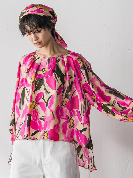 【デザインPOINT】「日常を特別にする、ペイントフラワー」ペイントタッチのフラワープリントが主役の、フレアブラウス。タックをほどこした分量感が動くたびに揺れる、華やかな一枚目。生地の落ち感を活かし、身頃から自然に広がるフレアシルエット。着丈に前後差をつけ、アウトで着てバランス良くきまる設定に。脇スリットと、後中央開きで、抜け感をプラス。【スタイリング】デニムやワイドパンツで、甘さを引き算した着こなしに。プリント内のカラーと、ボトムを同系色でまとめるのもおすすめです。【素材の特徴】【IPEKER VEGAN HABOTAI PRINT】トルコの老舗プリントメーカー、“IPEKER社”のアーティスティックなプリントをセレクト。キュプラレーヨンの薄地を特別な技術で、滑らかに仕上げています。----------------------------------------------------------------洗濯方法家庭洗濯:液温は30℃を限度とし、洗濯機で非常に弱い洗濯ができる。自然乾燥:日陰の吊り干しがよい。アイロン:底面温度160℃を限度としてアイロン仕上げができる。ドライクリーニング:石油系溶剤による弱いドライクリーニングができる。----------------------------------------------------------------■モデル身長 166cm 170cm / 着用サイズ M※画像の商品はサンプルとなりますので実際の商品と仕様、加工、サイズが若干異なる場合がございます。※お客様のモニター環境により実際のお色と多少異なる場合がございます。※撮影状況や光の当たり具合により、色合いが異なって見える場合がございます。関連ワード:MAYSON GREY メイソングレイ レディース 新作 大人コーデ 大人カジュアル 2026春夏 2026SS 春夏 春物 春服 ブラウス レーヨン 花・植物 総柄 長袖