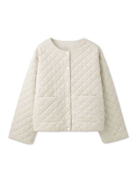 光沢感が美しいベロア素材をキルティングデザインで仕立てたコンパクトなノーカラージャケットです。