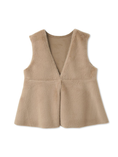 ウエストにかかるくらいの着丈で、ペプラムシルエットのファーベストはウエストまわりがもこもこしにくく、また、気温が上がる日中にはこもりがちな空気を逃しやすいのも嬉しいポイントです。