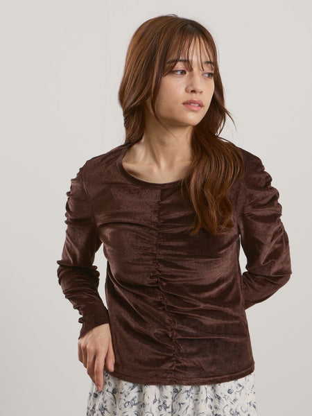 ●POINT軽やかな透け感のあるベロア素材を使用したギャザーデザインのプルオーバーです。毛足感のある素材なので、密度が高くなると一気にウォーム感を感じる素材ですが、近年の夏の長期化にあわせて人気の高い素材になっています。ベロア素材特有のシックな光沢感をいかして、フロントにギャザーを寄せて立体的なデザインへと変化。デイリー使いに限らず、あわせのボトムスによってカジュアルなパーティシーンでもご着用が可能なプルオーバーです。----------------------------------透け感:ややあり厚さ: 普通伸縮性:あり裏地: なしポケット: なし--------------------------------------------------------------------------------------------------洗濯方法家庭洗濯:液温は40℃を限度とし、手洗いができる。自然乾燥:日陰の吊り干しがよい。アイロン:アイロン仕上げ禁止。ドライクリーニング:石油系溶剤による弱いドライクリーニングができる。----------------------------------------------------------------■モデル身長 165cm 着用サイズ M※画像の商品はサンプルとなりますので実際の商品と仕様、加工、サイズが若干異なる場合がございます。※お客様のモニター環境により実際のお色と多少異なる場合がございます。※撮影状況や光の当たり具合により、色合いが異なって見える場合がございます。関連ワード:QUEENS COURT クイーンズコート レディース 新作 フェミニン 大人コーデ 2025秋冬 2025AW 秋冬 秋物 秋服 カットソー ポリエステル 無地 長袖 ベロア