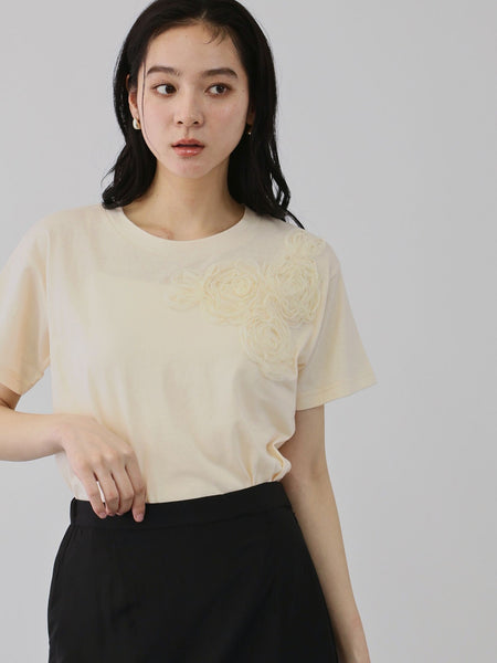 ●POINTふくらみのある安心感の感じられる肉感で、ナチュラルな質感が魅力の毛羽感の少ないコットン100%のファブリック(カットソー)を使用しています。胸元にアシンメトリーに配置したシアーチュール素材が織りなすコサージュライクなフラワーモチーフの可憐さが、静かに際立つプルオーバーです。ボディラインに寄り添うシルエットなので、タックインでご着用いただくと、フラワーモチーフにふと視線が吸い寄せられるような着こなしに。スカートスタイルでフェミニンに、スラックスにあわせてマニッシュスタイルの外しアイテムとしてもおすすめの一枚です。----------------------------------透け感:ややあり厚さ: やや薄い伸縮性:あり裏地: なしポケット: なし--------------------------------------------------------------------------------------------------洗濯方法家庭洗濯:液温は40℃を限度とし、手洗いができる。自然乾燥:日陰の吊り干しがよい。アイロン:底面温度120℃を限度としてアイロン仕上げができる。ドライクリーニング:石油系溶剤による弱いドライクリーニングができる。----------------------------------------------------------------■モデル身長 165cm 着用サイズ M※画像の商品はサンプルとなりますので実際の商品と仕様、加工、サイズが若干異なる場合がございます。※お客様のモニター環境により実際のお色と多少異なる場合がございます。※撮影状況や光の当たり具合により、色合いが異なって見える場合がございます。関連ワード:QUEENS COURT クイーンズコート レディース 新作 フェミニン 大人コーデ 2026春夏 2026SS 春夏 春物 春服 カットソー コットン ポリエステル 花・植物 半袖