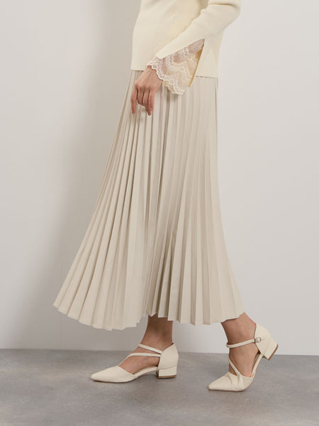 ●POINTリアルに近い質感やタッチにこだわった、非常に柔らかく、肌触りが良いシープレザーのような合皮素材を使用しています。滑らかで軽やかな素材なので、分量感のでるプリーツ加工を施しても重さが気になりにくいのが魅力です。ウエストはぐるりゴム使用でストレスの感じにくい着用感に。気温に左右されにくいので、気温が高い日にはTシャツ合わせで、秋めいた気温感の日にはジャケットなどを合わせていただいて、季節感をいち早く感じられる一枚です。同素材を使用したアイテムに、シープナッパ調ステンカラージャケット(2205-56066)がございます。----------------------------------透け感:なし厚さ: やや厚い伸縮性:あり裏地: なしポケット: なし--------------------------------------------------------------------------------------------------洗濯方法家庭洗濯:家庭での洗濯禁止。アイロン:アイロン仕上げ禁止。ドライクリーニング:石油系溶剤による弱いドライクリーニングができる。----------------------------------------------------------------■モデル身長 165cm 着用サイズ M※画像の商品はサンプルとなりますので実際の商品と仕様、加工、サイズが若干異なる場合がございます。※お客様のモニター環境により実際のお色と多少異なる場合がございます。※撮影状況や光の当たり具合により、色合いが異なって見える場合がございます。関連ワード:QUEENS COURT クイーンズコート レディース 新作 フェミニン 大人コーデ 2025秋冬 2025AW 秋冬 秋物 秋服 合成皮革 無地 ゴム プリーツスカート