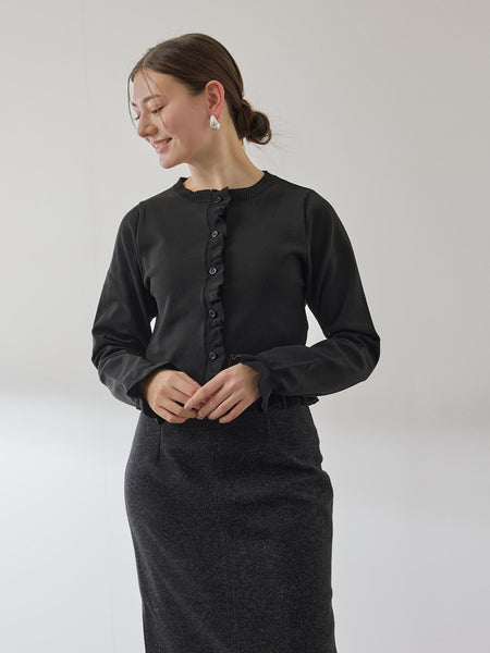 弾力感のあるスポンディッシュな素材を使用することで、前立て、裾、袖にあしらったフリルディテールを立体的に魅せるポイント。