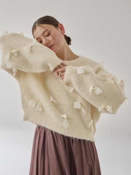 モコモコとした柔らかい肌触りと、立体感のある豊かな表情が魅力のブークレーニットにリボンを編み込んだプルオーバーです。