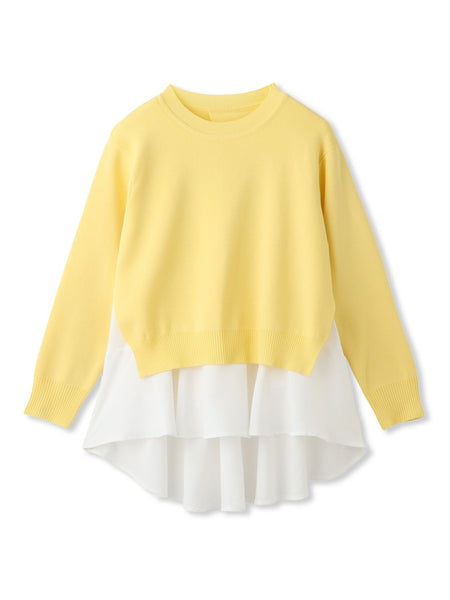 つややかな糸を使用し、ハイゲージで編立てたニットプルオーバーとペプラムラインのテキスタイルインナーがセットになったレイヤードアイテムです。