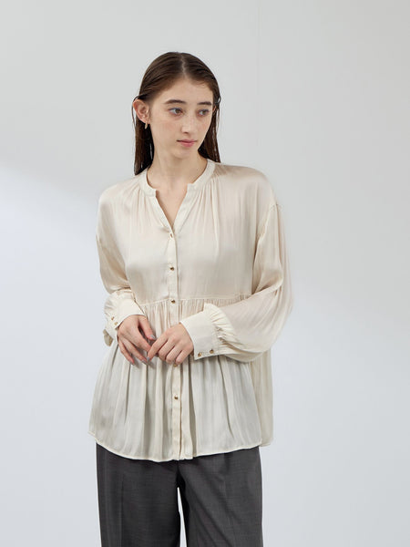 ●POINT特殊な糸を使って作られたとろみのある柔らかい風合いと控えめな光沢が特徴のサテン生地を使用しています。フラットすぎない表情で、繊細な凹凸感で、光と影のコントラストのある質感です。もともと扱いやすい素材ですが、ネック下、袖カフス上、ウエスト切り替え部分にギャザーディテールを取り入れて、一層シワが気になりにくいデザインになっています。分量感を感じながらも、素材の軽やかさやキーネックデザインで抜け感を演出するデザインに。季節が進むに連れてニットアイテムなどとの着合わせも増える時期におすすめの艶感ブラウスです。----------------------------------透け感:ややあり厚さ: やや薄い伸縮性:なし裏地: なしポケット: なし--------------------------------------------------------------------------------------------------洗濯方法家庭洗濯:液温は40℃を限度とし、手洗いができる。自然乾燥:日陰の吊り干しがよい。アイロン:底面温度120℃を限度としてアイロン仕上げができる。ドライクリーニング:石油系溶剤による弱いドライクリーニングができる。----------------------------------------------------------------■モデル身長 165cm 着用サイズ M※画像の商品はサンプルとなりますので実際の商品と仕様、加工、サイズが若干異なる場合がございます。※お客様のモニター環境により実際のお色と多少異なる場合がございます。※撮影状況や光の当たり具合により、色合いが異なって見える場合がございます。関連ワード:QUEENS COURT クイーンズコート レディース 新作 フェミニン 大人コーデ 2025秋冬 2025AW 秋冬 秋物 秋服 ブラウス ポリエステル サテン 無地 長袖