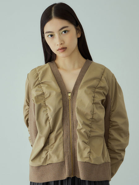 ●POINTハリのあるポリエステル素材とミラノリブニットをドッキングさせたニットブルゾンです。ミリタリーアウターのカジュアルさとニットガウンの優しさが共存するアイテムです。フロントのギャザーシャーリングデザインがアクセントのカーディガン感覚でご着用頂けるライトアウターです。スリーブ内側もニットで切り替えてギャザーを入れることで、より立体的なフォルムになりモードエッセンスをプラスします。Vネックデザインなので、秋口にはシアーインナーなどを入れて軽やかに、気温が落ち着いて来たらハイゲージのニットなどとのレイヤードで温かく。ボクシーなフォルムなので、ワイドパンツやフレアスカートなどにあわせて頂くと好バランスでご着用頂ける一枚です。----------------------------------透け感:なし厚さ: やや厚い伸縮性:なし裏地: なしポケット: なし--------------------------------------------------------------------------------------------------洗濯方法家庭洗濯:液温は40℃を限度とし、手洗いができる。自然乾燥:日蔭の吊り干しがよい。アイロン:底面温度120℃を限度としてアイロン仕上げができる。ドライクリーニング:石油系溶剤による弱いドライクリーニングができる。----------------------------------------------------------------■モデル身長 165cm 着用サイズ M※画像の商品はサンプルとなりますので実際の商品と仕様、加工、サイズが若干異なる場合がございます。※お客様のモニター環境により実際のお色と多少異なる場合がございます。※撮影状況や光の当たり具合により、色合いが異なって見える場合がございます。関連ワード:VICKY ビッキー レディース 新作 大人カジュアル 大人コーデ 2025秋冬 2025AW 秋冬 秋物 秋服 綿/コットン 合成繊維/ポリエステル アクリル ニット Vネック