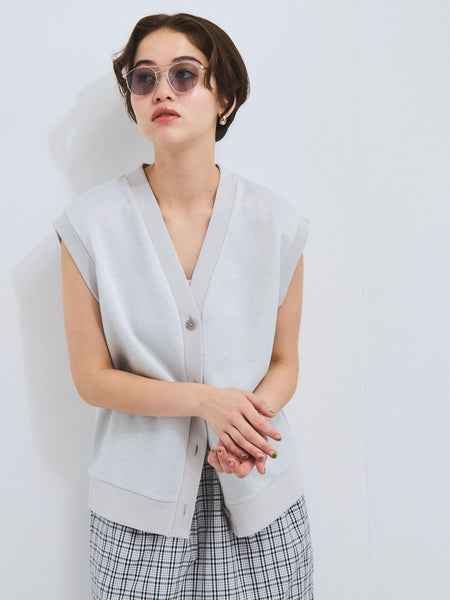 ●POINT微光沢感がポイントのラメ裏毛素材を使用した前開きベストはトップスとしてもちょっとした羽織としても便利なアイテムです。レイヤードスタイルとも相性の良いVネックデザインにし、着合わせのしやすさがポイントです。コンパクトなフォルムなので、今季トレンドのカーブパンツに合わせたコーディネートがおすすめです。ラメ混素材で、部屋着感を軽減してくれる大人顔のスウェットトップスです。----------------------------------透け感:淡色のみややあり厚さ: 普通伸縮性:あり裏地: なしポケット: なし--------------------------------------------------------------------------------------------------洗濯方法家庭洗濯:液温は40℃を限度とし、手洗いができる。自然乾燥:日蔭の吊り干しがよい。アイロン:底面温度160℃を限度としてアイロン仕上げができる。ドライクリーニング:石油系溶剤による弱いドライクリーニングができる。----------------------------------------------------------------■モデル身長 167cm 着用サイズ M※画像の商品はサンプルとなりますので実際の商品と仕様、加工、サイズが若干異なる場合がございます。※お客様のモニター環境により実際のお色と多少異なる場合がございます。※撮影状況や光の当たり具合により、色合いが異なって見える場合がございます。関連ワード:VICKY ビッキー レディース 新作 大人カジュアル 大人コーデ 2025春夏 2025SS 春夏 夏物 夏服 ベスト ラメ スウェット レイヤード Vネック