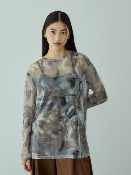 ●POINTアート風のマーブル柄がスタイリングにニュアンス感を与える一枚です。ブルー系はくすみブルー〜ブラウンのグラデーションに、グリーン系はカーキブラウン〜ベージュのグラデーションになっています。全体的に入っている柄のおかげでシアー感が鈍くなり、気恥ずかしさを軽減し、一枚でもサマになるデザインにです。秋口にはベストやオーセンティックなシンプルなシャツとのレイヤードスタイルがおすすめです。----------------------------------透け感:あり厚さ: 薄い伸縮性:あり裏地: なしポケット: なし--------------------------------------------------------------------------------------------------洗濯方法家庭洗濯:液温は30℃を限度とし、手洗いができる。自然乾燥:日蔭の吊り干しがよい。アイロン:底面温度120℃を限度としてアイロン仕上げができる。ドライクリーニング:石油系溶剤による弱いドライクリーニングができる。----------------------------------------------------------------■モデル身長 165cm 着用サイズ M※画像の商品はサンプルとなりますので実際の商品と仕様、加工、サイズが若干異なる場合がございます。※お客様のモニター環境により実際のお色と多少異なる場合がございます。※撮影状況や光の当たり具合により、色合いが異なって見える場合がございます。関連ワード:VICKY ビッキー レディース 新作 大人カジュアル 大人コーデ 2025秋冬 2025AW 秋冬 秋物 秋服 カットソー ポリエステル クルーネック 総柄 長袖