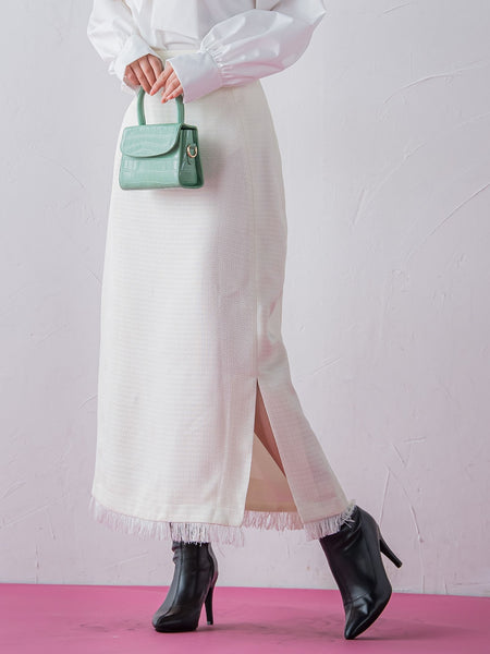 ●ポイント・秋らしさ満点のツイードスカート・一枚投入するだけで秋のムードがたっぷり・シンプルなトップスと合わせるだけでオシャレが叶う!・ナローシルエット●デザイン大人ガーリーな定番ツイードスカート!太すぎず細すぎないセミタイトなナローシルエットが登場!今季トレンドのツイード生地を使用したスカートなので1枚着ていただくだけで、季節感とこなれ感のあるお洒落コーデが完成します。タイトシルエットでありながらウエストゴムでストレスフリーな履き心地。裾スリットが入ってるので、歩きやすさもばっちり!歩くたびにスリットからさりげなく見える肌見せが、大人な印象に。●オススメコーデハイウエストデザインだから、どんなトップスにもバランス良く合わせられるのが嬉しい。暑い時期はTシャツやブラウス。冬に向けてはニット合わせも可愛い。スニーカーと合わせたカジュアルミックスも相性抜群。こなれ感のある大人カジュアルコーデが完成します。トップスインですっきりスタイルUPのスタイリングがオススメです。 【骨格タイプの説明】・ストレートタイプ全体的に筋肉質で体にメリハリがあるタイプ腰とバスト位置も高く厚みがあり、ひざ下は細目・ウェーブタイプ全体的に柔らかな曲線の体のライン重心が下半身にあり、上半身は華奢で薄い印象・ナチュラルタイプ筋肉や脂肪があまり感じられなく重心の偏りがないタイプ骨組みはしっかりしており、関節が目立ちやすい----------------------------------洗濯方法家庭洗濯:液温は30℃を限度とし、洗濯機で非常に弱い洗濯ができる。自然乾燥:日蔭の吊り干しがよい。アイロン:底面温度110℃を限度としてアイロン仕上げができる。ドライクリーニング:石油系溶剤による弱いドライクリーニングができる。----------------------------------■モデル身長 162cm/163cm 着用サイズ M※画像の商品はサンプルとなりますので実際の商品と仕様、加工、サイズが若干異なる場合がございます。※お客様のモニター環境により実際のお色と多少異なる場合がございます。※撮影状況や光の当たり具合により、色合いが異なって見える場合がございます。関連ワード:VICKY ビッキー レディース 夏物 夏服 秋物 秋服 新作 大人カジュアル ポリエステル シンプル キレカジ フェミニン ガーリー ゴム タイトスカート ツィード フリンジ 2023秋冬 15度から20度の気温におすすめ