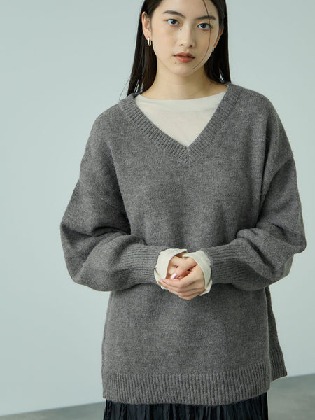アルパカ混のようにふんわりと軽やかで、柔らかい肌触りが特徴の糸を使用したチュニックVネックニットプルオーバーです。
