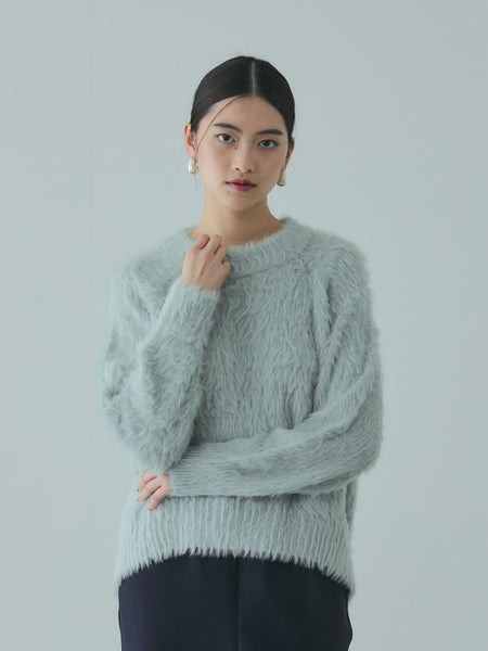 思わず頬ずりしたくなるような柔らかさと軽やかな空気感をプラスする毛足のあるシャギーニット素材を使用しています。