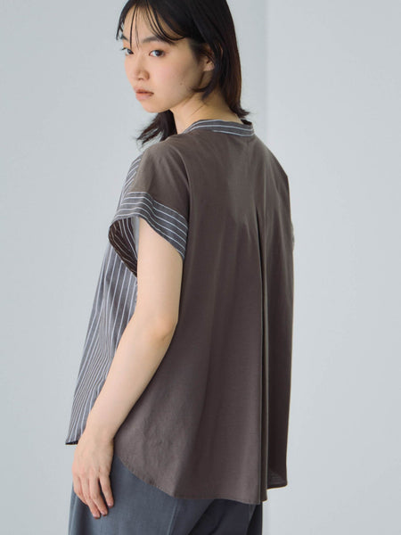 ●POINT前身頃をストライプのテキスタイル、後身頃をクリアなテクスチャーのカットソー生地で切り替えた異素材切替のプルオーバーで、ブラウスのようなきちんと感とTシャツのもつイージーな着心地を併せ持つ一枚です。バンドカラーのキーネックデザインで首元を軽やかに演出します。腰にかかる着丈なのでタックインでもアウトでも着合わせのしやすいデザインです。----------------------------------透け感:淡色のみややあり厚さ: 普通伸縮性:なし裏地: なしポケット: なし--------------------------------------------------------------------------------------------------洗濯方法家庭洗濯:液温は40℃を限度とし、洗濯機で弱い洗濯ができる。自然乾燥:日蔭の吊り干しがよい。アイロン:底面温度160℃を限度としてアイロン仕上げができる。ドライクリーニング:石油系溶剤による弱いドライクリーニングができる。----------------------------------------------------------------■モデル身長 165cm 着用サイズ M※画像の商品はサンプルとなりますので実際の商品と仕様、加工、サイズが若干異なる場合がございます。※お客様のモニター環境により実際のお色と多少異なる場合がございます。※撮影状況や光の当たり具合により、色合いが異なって見える場合がございます。関連ワード:VICKY ビッキー レディース 新作 大人カジュアル 大人コーデ 2025秋冬 2025SS 秋冬 秋物 秋服 ブラウス コットン ポリエステル ストライプ 半袖