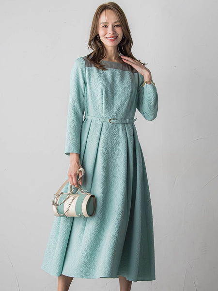 【デザインの特徴】ポコポコとした表情感が特徴のフクレジャガード素材を使用した上品なワンピース。前身頃のデコルテ部分にはシアーサテン生地を切り替え、トレンド感と抜け感をプラスしています。同素材とフェイクレザーを組み合わせた加工ベルト付きで、高級感のある仕上がりに。フィット&フレアの美しいシルエットが女性らしさを引き立て、日常から特別なシーンまで幅広く活躍します。洗練されたデザインと素材の組み合わせで、大人の魅力を存分に感じられる一着です。----------------------------------------------------------------洗濯方法家庭洗濯:液温は30℃を限度とし、洗濯機で非常に弱い洗濯ができる。自然乾燥:日陰の吊り干しがよい。アイロン:底面温度160℃を限度としてアイロン仕上げができる。ドライクリーニング:石油系溶剤による弱いドライクリーニングができる。----------------------------------------------------------------■モデル身長 169cm/着用サイズ M※画像の商品はサンプルとなりますので実際の商品と仕様、加工、サイズが若干異なる場合がございます。※お客様のモニター環境により実際のお色と多少異なる場合がございます。※撮影状況や光の当たり具合により、色合いが異なって見える場合がございます。※商品タグに記載されたサイズはヌードサイズです。実際の商品のサイズは商品情報の実寸をご確認ください。関連ワード:Viaggio Blu ビアッジョブルー レディース 新作 大人カジュアル 大人コーデ レディース キレイめ フェミニン エレガント 華やか 上品 秋 秋服 2025AW AW 2025秋冬