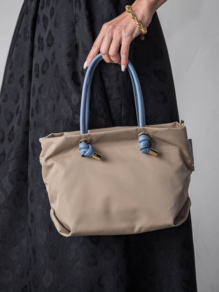 シンプルなデザインのボディにノットハンドルがアクセントになったトートバッグのSサイズ。内側は3層に分かれており、ファスナーを閉めたままアオリポケットにスマホやパスなどを収納できるので通勤などで安心してお使い頂けます。長財布やペットボトルなどが収納でき、ショルダーストラップ付きの2WAY仕様です。 弱撥水性があるのでお手入れも簡単で、軽量なのも特徴です。