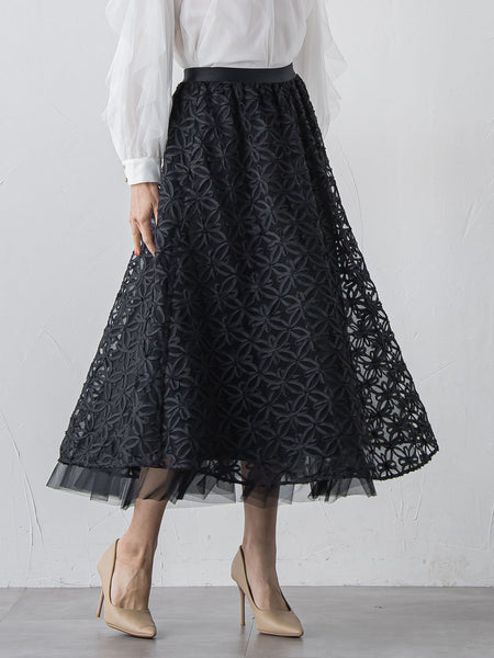 【デザインの特徴】ドラマティックな装いを叶えるフレアースカート。テープ刺繍でフラワーモチーフを表現した意匠素材。下には柔らかで繊細なチュールを重ねた特別感のある仕上がり。ウエストはサテンゴムを使用し心地よい着用感です。【素材の特徴】シフォンの生地をテープ状にカット、テープ刺繍の織機を使用しチュール上に刺繍を施した大変繊細で意匠性の高い素材。繊細なチュール素材を贅沢に重ねエレガントに仕上げています。----------------------------------------------------------------洗濯方法家庭洗濯:家庭での洗濯禁止。アイロン:底面温度120℃を限度としてアイロン仕上げができる。ドライクリーニング:石油系溶剤による弱いドライクリーニングができる。----------------------------------------------------------------■モデル身長 169cm/着用サイズ M※画像の商品はサンプルとなりますので実際の商品と仕様、加工、サイズが若干異なる場合がございます。※お客様のモニター環境により実際のお色と多少異なる場合がございます。※撮影状況や光の当たり具合により、色合いが異なって見える場合がございます。※商品タグに記載されたサイズはヌードサイズです。実際の商品のサイズは商品情報の実寸をご確認ください。関連ワード:Viaggio Blu ビアッジョブルー レディース 新作 大人カジュアル 大人コーデ レディース キレイめ フェミニン エレガント 華やか 上品 秋 秋服 2025AW AW 2025秋冬