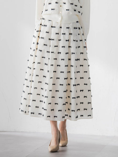【デザインの特徴】リボンの様なカットジャカードが目を惹くタフタ素材のタックフレアースカート。バックゴムデザインで心地よい着用感です。ドラマティックなフレアーシルエットですが、張り感は抑えているので落ち着いた印象です。スカート一枚で主役になる存在感ですが、モノトーンカラーなのであらゆるトップスとも合わせていただけます。【素材の特徴】細かいグログラン組織のタフタベースにリボンの様な柄が入ったカットジャカード素材。表情のある糸を使用し、ベースとのコントラストをつけた意匠素材です。白ベースには黒、黒ベースには黒の同色で上品な印象です。シワになりにくく、シーズンレスできていただけます。----------------------------------------------------------------洗濯方法家庭洗濯:家庭での洗濯禁止。アイロン:底面温度120℃を限度としてアイロン仕上げができる。ドライクリーニング:石油系溶剤による弱いドライクリーニングができる。----------------------------------------------------------------※リボンが抜ける場合がございますので引っ張らないようにご注意ください。※画像の商品はサンプルとなりますので実際の商品と仕様、加工、サイズが若干異なる場合がございます。※お客様のモニター環境により実際のお色と多少異なる場合がございます。※撮影状況や光の当たり具合により、色合いが異なって見える場合がございます。※商品タグに記載されたサイズはヌードサイズです。実際の商品のサイズは商品情報の実寸をご確認ください。関連ワード:Viaggio Blu ビアッジョブルー レディース 新作 大人カジュアル 大人コーデ レディース キレイめ フェミニン エレガント 華やか 上品 秋 秋服 2025AW AW 2025秋冬