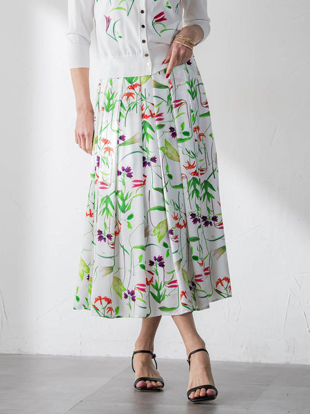 【デザインの特徴】フラワーアーティスト川崎景太の作品〈HANA GRAPHIC Art〉とのコラボシリーズ。”生花を纏う”をコンセプトに、土に根付き瑞々しく咲き誇り・生きる花々をインクジェットプリントで再現しました。様々な種類のLilyを使用した作品をプリントした上品なタックフレアースカート。鮮やかな花の色が際立つ配色切替のウエストベルト。タックフレアーをたっぷり入れて、エレガントな印象に。同素材のブラウス(2613-62112)とセットアップで着ていただくと華やかさアップ。【素材の特徴】サテン生地に鮮やかなインクジェットプリントを施しました。落ち感の美しさとシーズンレスで着用していただける肉感が魅力的な素材です。----------------------------------------------------------------洗濯方法家庭洗濯:液温は30℃を限度とし、洗濯機で非常に弱い洗濯ができる。自然乾燥:日陰の吊り干しがよい。アイロン:底面温度160℃を限度としてアイロン仕上げができる。ドライクリーニング:石油系溶剤による弱いドライクリーニングができる。----------------------------------------------------------------■モデル身長 169cm/着用サイズ M※画像の商品はサンプルとなりますので実際の商品と仕様、加工、サイズが若干異なる場合がございます。※お客様のモニター環境により実際のお色と多少異なる場合がございます。※撮影状況や光の当たり具合により、色合いが異なって見える場合がございます。※商品タグに記載されたサイズはヌードサイズです。実際の商品のサイズは商品情報の実寸をご確認ください。関連ワード:Viaggio Blu ビアッジョブルー レディース 新作 大人カジュアル 大人コーデ レディース キレイめ フェミニン エレガント 華やか 上品 春 夏 2026春夏 2026SS 春服 夏服
