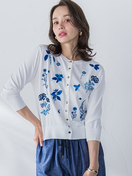 ハーブをテーマにしたボタニカルモチーフの刺繍がポイントのクルーネックカーディガン。